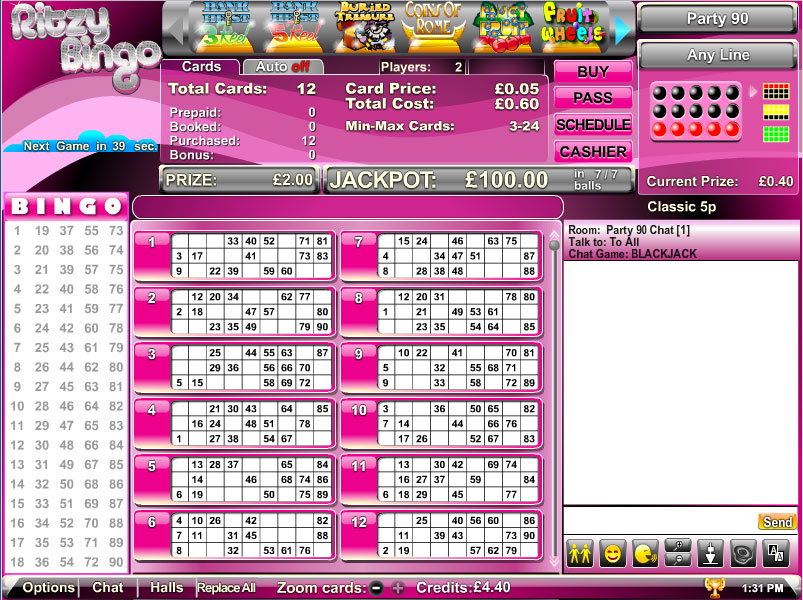 Another advantage of Ritzy Bingo is the wide range of bingo games that are available. You can choose to play in the traditional bingo halls or try your hand at some of the new style of bingo games like Instant Bingo or Jingo Bingo. And best of all you can play all of these bingo games in 30 Ball, 75 Ball, 80 Ball and 90 Ball. There are six main halls as well as a free hall to hone your skills and learn how to navigate the user interface, combined with the fact cards are available for as little as 1p there will always be the right game available for you to play.